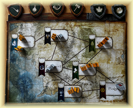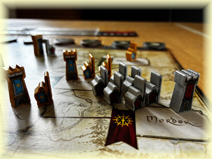 Spielerisch muss man hier zum Glück kein Kriegsspiel erwarten, es geht nur um die Präsenz in den verschiedenen Regionen. Stehen Einheiten von Sauron und den freien Völkern zusammen in derselben Region, tauschen diese sich gegenseitig ab bis nur noch eine (oder keine) Fraktion übrig ist. Ausgenommen sind nur Türme, die (fast) nicht entfernt werden können und auch mit fremden Türmen oder Einheiten in einem Feld stehen dürfen.