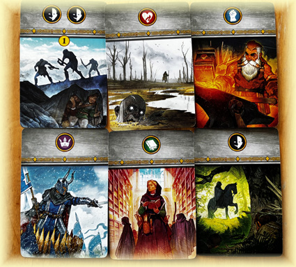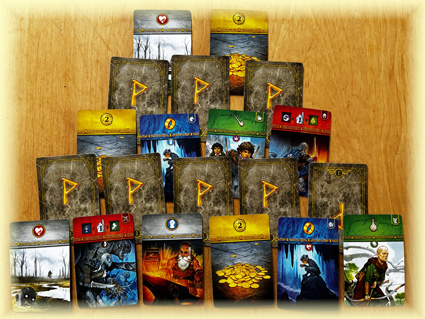 Die Karten haben verschiedene Farben, die für ihre verschiedenen Funktionen stehen. Da sind erst mal die grauen Karten, die für die verschiedenen Fähigkeiten (Mut, Stärke, Wissen usw.) der Helden stehen. Viele der anderen Karten im Spiel benötigen bestimmte Fähigkeiten, damit man sie überhaupt spielen darf.