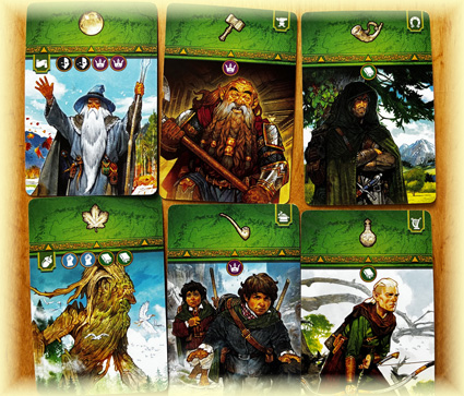 Dann gibt es noch gelbe Karten, die einfach Geld bringen – Geld ersetzt fehlende Fähigkeiten – und blaue Karten mit Gollum und dem Ring. Diese Ringkarten bewegen entweder den Ringträger einen Schritt weiter nach Mordor oder lassen die Ringgeister näher zum Ringträger aufschließen.