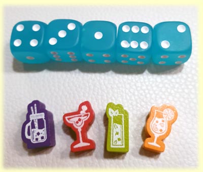 Ausstattung: Die für Iello ungewöhnlich kleine Schachtel (13 mal 18 mal 4 cm) enthält 5 normale sechsseitige Augenwürfel, viele bunte Miniaturmarker aus Holz in 4 Cocktailformen und in 4 Spielerfarben. Des weiteren ist für jeden Spieler ein Punktetableau vorhanden. Und dann kommen noch 25 doppelseitig bedruckte stabile Papp-Untersetzer für Drinks zutage, die in üblicher Größe sind wie in einer Bar.