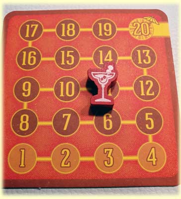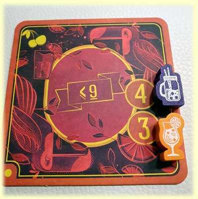 2) 1 Cocktail-Marker platzieren: Genau 1 deiner Marker muss auf einen Untersetzer gestellt werden, dessen Würfel-Anforderungen zu deinem Wurf passen. Und es muss ein freier Platz für deinen Marker existieren, wobei derselbe Spieler nie 2 Marker auf dem selben Untersetzer haben darf. Für die Platzierung winken 1 bis 4 direkte Punkte vom aktuellen Untersetzer plus 1 Punkt für jeden benachbarten Untersetzer (auch diagonal) mit einem Marker von dir.