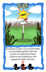 Gnadenlos wird allen Enten, natürlich bis auf die eigenen, das Leben schwer gemacht. Mitleid gibt es in diesem Spiel nicht! Jeder Spieler versucht seine 5 Enten, die in zufälliger Reihenfolge ins Schussfeld geraten, möglichst unbeschadet durch den Teich zu geleiten. Abgeschossen wird alles, was vor dem Zielrohr schwimmt. Wohl der einen oder anderen Ente, die durch ein Defensivmanöver in Deckung gehen oder ihr Schwänzchen in die Höhe strecken kann.