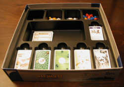 Abstriche muss man leider an der Spielverpackung selbst machen: sie ist aus normalem Karton und lässt sich nicht sonderlich gut reisegerecht verschließen. Packt man ein unterbrochenes Spiel schnell wieder ein, weil es zu regnen anfängt (Achtung: nicht wasserdicht!) oder der Zug anhält, verkuddelmuddelt sich das ganze Material sobald die Box in die Vertikale gerät, da zwischen Spielbrett und Deckel einiges an Luft ist. Ein Paar passende Kartonplatten schaffen hier evtl. Abhilfe.
