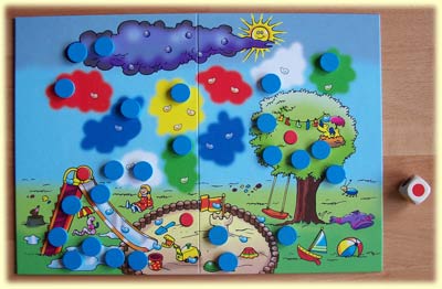 Der Spielplan zeigt einen Himmel mit einer großen schwarzen Regenwolke und vielen kleinen farbigen Regenwolken. Weiters einen nassen Kinderspielplatz, wobei die Nässe durch aufgemalte Regentropfen dargestellt wird. Auf diese 25 Regentropfen werden kleine blaue Holzscheiben gelegt. Neben diesen Vorbereitungen sind nur mehr die Karten zu mischen und der Würfel bereitzulegen, dann kann es auch schon losgehen.