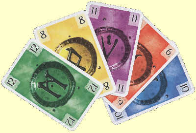 Die verschiedenfarbigen Siegel werden in die Tischmitte gelegt. .Es gibt je nach Anzahl der Mitspieler verschieden viele Kartenfarben, insgesamt aber maximal 6 Farben. Die Karten haben die Werte 1-15.