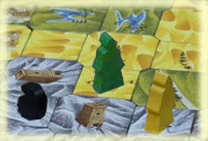 So umfasst das fertige Spiel jetzt die oben genannten Plättchen und je nach Anzahl der Spieler, zwei bis fünf können sich daran beteiligen, wird eine Stadtauslage aufgebaut. Die Plättchen selbst zeigen eine von drei möglichen Landschaften (Hügelland, Wüste oder Gebirge) und einige davon eine von drei möglichen Eigenschaften (Wachturm, See oder Karawane). Folgende Legeregeln sind zu beachten: Die großen Plättchen dürfen nur an den kurzen Kanten aneinandergelegt werden. An die sich daraus ergebenden langen Kanten werden die kleinen Landplättchen angelegt, somit können also nie zwei kleine Plättchen aneinander liegen. Je nach Position zum Startspieler gibt es schon eine Grundausstattung an großen und kleinen Plättchen sowie Münzen. Im Stadtzentrum stehen zu Beginn des Spiels die zwei Figuren eines jeden Spielers, nämlich die Legion und der Censor. Der Censor war übrigens ein hoher römischer Beamter. Unter anderem war er für die Volks- und Vermögensschätzung und die Besetzung des Senats zuständig.
