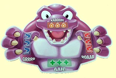 Gewürfelt wird um Angriffssymbole. Ich kann beliebig viele meiner drei Würfel nach jedem Wurf raus- oder wieder reinnehmen. Will ich den Spieler links von mir angreifen, muss ich 3x den blauen Dino mit dem Pfeil nach links würfeln. Dann rufe ich „GRRRR“, verpasse meinem Gegner einen Schaden und würfle weiter. Soll der rechts von mir dran glauben, muss es 3x das rote Symbol sein. Dann rufe ich „ROAAR“. Will ich allen Gegnern auf einmal einen Schaden geben, muss ich drei Flammen würfeln und „KABOOM“ rufen. Dann müssen alle aufhören zu würfeln, bekommen einen Schaden und zur Seite gelegte Würfel muss man neu werfen.