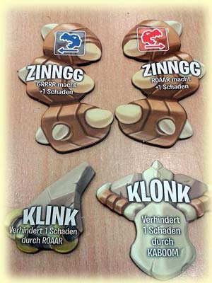 Will ich Schaden loswerden, sollte ich grüne Kreuze würfeln. Bei drei davon rufe ich „AAH!“ und darf einen Schaden heilen. Das ist wichtig, denn bei vier Schaden scheidet man für die Runde aus und der Verursacher bekommt ein „K.O.“-Plättchen, Wert: ein Punkt. Wessen Dino als letzter steht, bekommt ein Siegerplättchen, Wert: drei Punkte. Dieses Hauen und Hauen geht so lange, bis jemand 10 Punkte gesammelt hat. Und das passiert nach spätestens 20 Minuten.