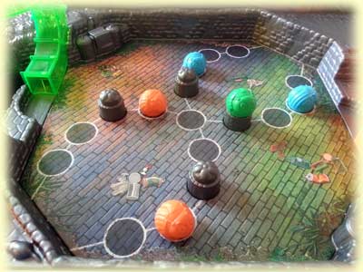 Dabei werden vielleicht auch die Käfer im Hof von ihr umher geschoben. Ist die Kakerlake wieder weg, prüfen deshalb alle, wo die Käfer stehen. Berühren sie ein Feld? Kommen sie wieder drauf. Berühren sie zwei Felder? Kommen sie auf das Bessere von beiden. Berühren sie kein Feld mehr? Dann geht es zurück an den Start.