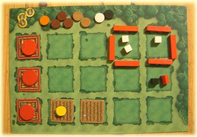 In Agricola versetzen wir uns in die Lage eines mittelalterlichen bäuerlichen Ehepaares, das vermutlich gerade einen kleinen Hof geerbt hat und nun vor der Aufgabe steht, diesen zu bewirtschaften. Auf zweien des in 3 x 5 Segmente unterteilten Hofes steht das spartanische Holzhaus, ansonsten - na ja, gibt's noch viel Raum für kreative Ideen ... Außer uns gibt es auch noch weitere Bauernfamilien, die vor der gleichen Situation stehen - warum also nicht einen kleinen Wettstreit um den Titel "Bauer des Monats" veranstalten?