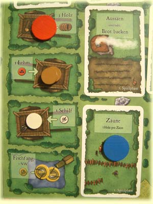Wollen wir eher Viehzucht betreiben, müssen wir uns zunächst Holz besorgen. Mit diesem können wir dann Weidezäune und Ställe errichten, bevor wir endlich Tiere anschaffen können - ansonsten würden sie ja weglaufen. Für eine Spezialisierung auf den Ackerbau müssen wir zuerst einen Acker pflügen. Danach besorgen wir uns das Saatgut, damit es dann in einer weiteren Aktion ausgesät werden kann. Um unsere Familie und damit die Anzahl unserer Aktionen zu vergrößern, müssen wir erst Holz und Schilf besorgen, mit dem wir dann das Haus vergrößern können - Junior braucht schließlich ein eigenes Zimmer! Und Junior zu bekommen, ist wieder eine eigene Aktion ...