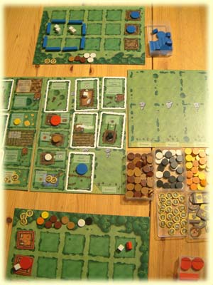 Nachdem wir das geklärt hätten, wenden wir uns dem Spiel zu, bei dem es sich um ein echtes Schwergewicht handelt. Und das im wörtlichen Sinne: Die prallgefüllte Schachtel bringt über 2 kg auf die Waage! Hier handelt es sich wirklich einmal nicht um eine Mogelpackung, bei der die Pöppel in ihren überdimensionierten Behausungen ein Echo hören würden, wenn sie denn rufen könnten. Nein, hier gibt es neben den acht Spielplänen und einem eigenen Satz Spielsteinen für jeden der bis zu 5 Spieler noch ca. 10 verschiedene Sorten von Spielsteinen aus Holz, ganz zu schweigen von den dicken Pappplättchen zur Markierung von Hütten und Äckern. Uups, die 360 (!) Karten hätte ich fast vergessen.