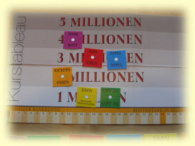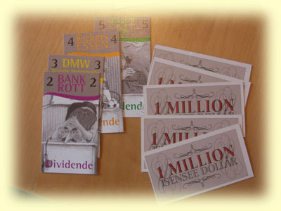 Die Spieler nehmen jetzt wieder ihr privates Geld in die Hand, zahlen eventuell etwas auf ihr Konto ein und es folgt die nächste Runde, so lange, bis ein Spieler die 25 Millionen SF Marke (entspricht ca. 20,5 Millionen €) auf seinem Konto erreicht. Am Ende dieser Runde gewinnt dann der Spieler mit dem meisten Geld (in Euro oder Franken, wie Sie wollen, aber vergessen Sie nicht, was ich am Anfang zum Thema "sicher" geschrieben habe).