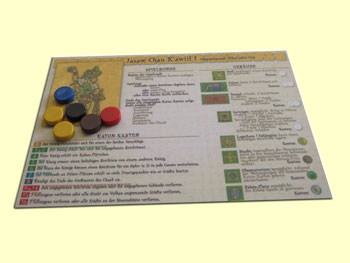 Die Spielanleitung ist keine leichte Kost. Sie ist zwar gut verständlich und mit Beispielen versehen, führt aber durch viele Verweise, verbunden mit ständigem Hin- und Herblättern, zu keinem schnellen Spieleinstieg. Man kennt nach dem Durchlesen zwar alle Details, weiß aber nicht genau, worauf es anfangs ankommt und wie man am besten beginnt. Gerade bei einem Spiel dieser Komplexität wäre es wünschenswert gewesen, wenn man einen möglichen Spielfeldaufbau und strategische Tipps beigelegt hätte. Leider muss man dazu erst einen Blick auf die Homepage des Verlages werfen. Hat man diese Einstiegshürde jedoch genommen, gestaltet sich der Spielablauf deutlich einfacher als erwartet. Zudem erhält jeder Spieler mit der Königskarte, auf der er seine Reichtümer vor sich lagert, eine Komplettübersicht über Spielablauf, Katun-Karten, Gebäudearten und -kosten.