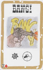 Geschossen wird mit den Bang-Karten. Wenn ich sie lege, gebe ich an auf wen ich geschossen habe. Der angegriffene Spieler kann nun seinerseits, auch wenn er nicht an der Reihe ist, mit einer Fehlschusskarte abwehren oder durch einen tüchtigen Schluck Bier sein Leben erhalten. Ansonsten muss er einen Lebenspunkt abziehen.