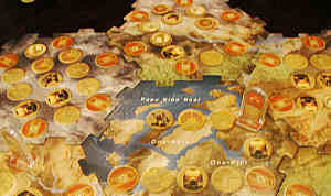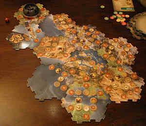 Diese Begrifflichkeiten erschweren meiner Meinung nach den Einstieg ins Spiel. Abgesehen von den unwesentlichen Textpassagen, bleiben die spielbeschreibenden Teile oft unklar. Die Bewegung (ein wesentlicher Teil des Spielablaufs!) warf bei uns Fragen auf, auf die an keiner Stelle eine Antwort gefunden wurde (dürfen mehrere Figuren auf einem Feld stehen, dürfen Figuren über andere drüber laufen). Auch das Entdecken neuer Landschaften war für uns zunächst nicht eindeutig. So befinden sich auf den Anschlussfeldern teilweise Symbole, die - wie wir später auf Grund von Abbildungen in der Regel vermuteten und dann einfach beschlossen - völlig bedeutungslos sind, obwohl mache Abbildungen den Eindruck hinterließen, als müssen die Symbole zweier Anschlussfelder zum Anlegen übereinstimmen.