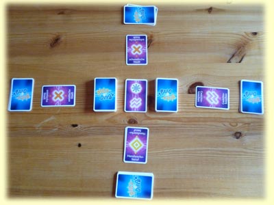 Eines der beiden Kartensets wird in zwei gleichgroße Stapel aufgeteilt. Wer an der Reihe ist, deckt von einem beliebigen Stapel eine Karte auf und legt sie vor sich hin. Danach überprüfen alle, ob es zu einem Duell kommt. Dies ist der Fall, wenn die aufgedeckte Karte dasselbe Symbol wie die vor einem Mitspieler ausliegende Karte zeigt. In diesem Fall müssen die beteiligten Spieler so schnell wie möglich die richtige Lösung rufen.