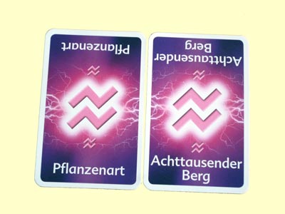 Diese ergibt sich immer aus der Karte des Kontrahenten. Dort ist nämlich ein Begriff zu sehen, zu dem man eine passende Antwort finden muss (zum Beispiel würde die Antwort "Mount Everest" zum Begriff "Achttausender Berg" passen). Wer zuerst eine richtige Lösung nennt, erhält die Karte des Mitspielers und legt sie auf seinen Siegpunktstapel.
