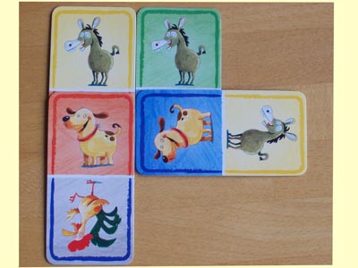 Wer an der Reihe ist, spielt eine Karte aus. Dabei muss er eine Hälfte dieser Karte sowohl farbig als auch thematisch passend auf einer bereits liegende Kartenhälfte platzieren. Zum Beispiel kann man also zu Beginn auf den blauen Esel einen blauen Hund legen. Die zweite Kartenhälfte muss entweder auf der leeren Tischhälfte oder auf einer ebenfalls passenden Kartenhälfte zum Liegen kommen. Wer keine passende Karte besitzt, muss eine nachziehen.