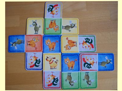 Bei diesem Ablagespiel werden Karten übereinander gestapelt - denn wie im Märchen steht der Hund auf dem Esel, die Katze auf dem Hund und der Hahn auf der Katze - zusätzlich müssen auch die Farben noch passen. Wer durch dieses Stapeln seine Karten zuerst loswird, hat das Spiel gewonnen.