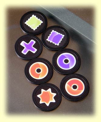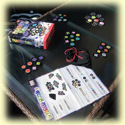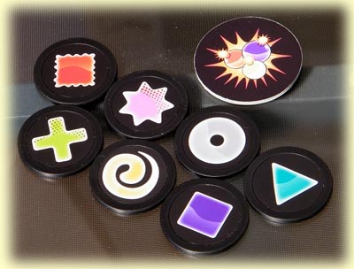 Ein paar jeweils einfarbige Aufgabenkarten, ein paar Karten mit Formen als Vorgabe und die Bubble Bomb, eine besondere Aufgabenkarte. Außerdem jeweils 7 Chips direkt vor mir und jedem meiner Mitspieler sowie deren 9 in der Tischmitte. Alle Chips zeigen beidseitig Symbole in einer bestimmten Farbe. Griffbereit in der Nähe liegt ein Stoffsäckchen mit Ersatzchips.