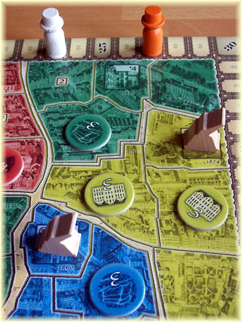 Einmal ausliegende Plättchen werden nicht mehr bewegt, was bedeutet, dass man wohl überlegen muss, wo man sein Bauplättchen hinlegt. Der Autor hat sich dabei folgendes Wertungssystem ausgedacht: Für jedes ausgelegte Plättchen bekommt man immer sofort die Punkte, die auf dem Plättchen aufgedruckt sind. Da es drei Sorten Plättchen gibt (Park, Haus, Villa) erhält man für gleiche Plättchen im selben Areal die Punkte dieser Plättchen auch noch dazu. Manche Felder tragen eine "2", was 2 Extrapunkte bedeutet oder ein Münzsymbol, was den Erhalt einer Münze sichert. Dies ist übrigens die einzige Möglichkeit, an Geld zu kommen, und unglücklicherweise darf man immer nur drei Münzen besitzen.