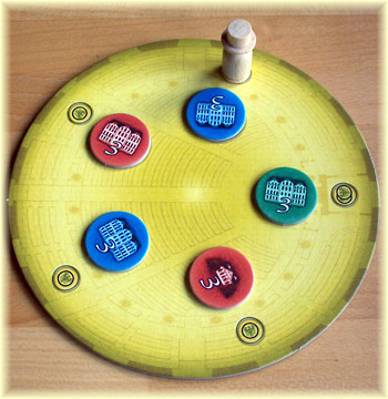 Nachgezogen wird nicht aus einem allgemeinen Vorrat, sondern von einer Angebotstafel mit 5 offen ausliegenden Bauplättchen. Diese Plättchen kosten in der Regel Geld - 1 oder 2 Münzen - und sind nur in einem Fall kostenlos, wenn nämlich die Figur des Bürgermeisters das Geld/Preisfeld auf der Angebotstafel zudeckt. Damit dies nicht immer das gleiche Feld ist, wandert der Bürgermeister nach jedem Zug ein Feld auf der Angebotstafel weiter (Aktion 4). Logischweise muss die Angebotstafel wieder aus dem allgemeinen Vorrat aufgefüllt werden, was die fünfte Aktion des Spielers ist.