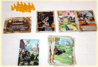 Weitere Bauwerke sind Riesentürme, mit denen du Lehnsgüter miteinander verbinden, sowie Lager, mit denen du leere Gebiete kontrollieren kannst. Und schließlich findest du unter den Erkundungskarten noch Schriftrollen, welche dir zusätzliche Siegpunkte, 'tschuldigung: Goldene Karotten einbringen können.
