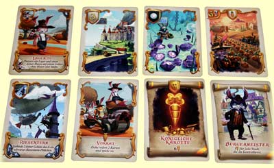 Mit den Schriftrollen kommt jedoch noch eine weitere Komplikation hinzu. Zwar bringen einige Schriftrollen - vor allem die Schätze - eine fixe Belohnung am Spielende, für den überwiegenden Teil müssen jedoch gewisse Voraussetzungen erfüllt werden, bzw. ist die Anzahl der Karotten von bestimmten Faktoren abhängig. Als Beispiel möchte ich den "Bürgermeister" anführen, welcher einem Spieler 1 Karotte pro von ihm kontrollierte Stadt bringt. Oder den "König der Fischer", welcher einen Spieler sogar mit 20 Karotten belohnt, wenn er mindestens 7 Fische produziert.