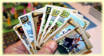 Sämtliche Aktionen, die ich eingangs erwähnt habe, werden mit Hilfe von Karten - den sogenannten "Erkundungskarten" - ausgeführt. Von den insgesamt 182 Karten sind mehr als die Hälfte Gebietskarten. Für jedes der 100 Gebiete des Plans ist genau eine Gebietskarte vorhanden (z. B. F8) mit deren Hilfe du es in Besitz nimmst und mit einer niedlichen Hasenfigur deiner Farbe markierst.