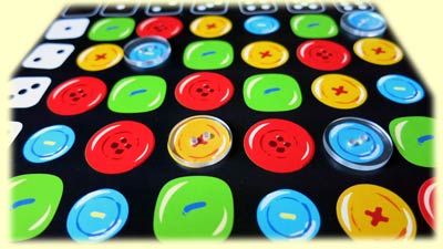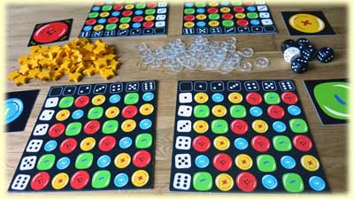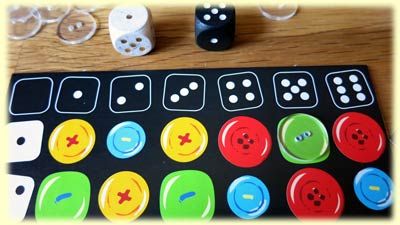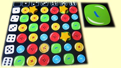 Jeder Spieler erhält bei Buttons einen Spielplan, der 36 Knöpfe in vier Farben sowie an zwei Rändern Würfelablagefelder für die Würfelaugen 1 bis 6 in den Farben schwarz und weiß zeigt. Außerdem erhält jeder Mitspieler eine Knopfkarte in einer der vier Knopffarben (rot, blau, gelb, grün).