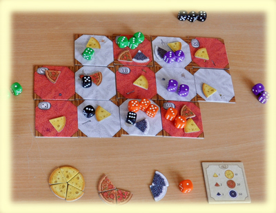 Tatsächlich sind beide Spiele unterschiedlich genug, sodass man den Autoren Brett J. Gilbert und Trevor Benjamin keine Plagiatsvorwürfe machen darf. Statt auf sechs Kasinos setzen wir hier auf Feldern eines an die Spielerzahl angepassten variablen Planes ein, auf dem Leckerbissen liegen: Käseecken, Pizzaecken und Tortenstücke. Einzeln nur wenige Punkte wert, zu fünft als kompletter Kreis sehr wertvoll. Wer sich so zuerst 50 Punkte schnappt, gewinnt.