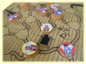 Bevor es losgeht, wollen wir uns auf dem Schiff (= Spielplan) umschauen. Hier findet alles auf dem Deck statt, das wir von sechs Startfeldern aus betreten können. Von hier hat man immer zwei Richtungen, in die man sich halten kann. Treten wir auf das Deck, gelangen wir auf eines von 12 Feldern, die in jeweils drei Richtungen Nachbarn haben. Bewegen darf man sich aber nie in die Richtung, aus der man soeben gekommen ist, man muss sich immer nach links oder nach rechts halten und darf nie rückwärts gehen. Dies wird durch das richtige Ausrichten der Spielsteine verdeutlicht, die sowohl Herkunft als auch mögliche Richtungen anzeigen.