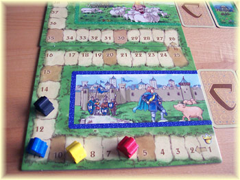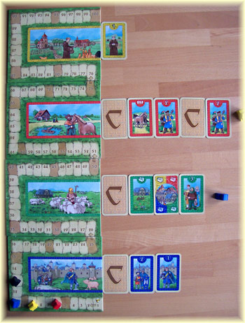 Der Spielplan besteht aus 4 Teilen und wird so zusammengesetzt, dass die Wertungsleiste sinnvoll zu lesen ist. Und da sehen wir also eine Stadt mit Ritter und Hausschweinen, eine Wiese mit Bauer und Schafen, eine Straße mit Reiter plus Pferd und schließlich ein Kloster mit Hühnern und einem Mönch: Figuren, die aus Carcassonne gut bekannt sind, und Tiere, die jetzt neu dazukommen.