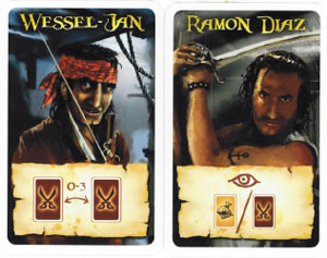 Und nun geht es ans Eingemachte: An der Meuterei nehmen nur jene Spieler teil, die ihre Gesinnung festgelegt haben; alle anderen scheiden aus! An Bord stehen sich 10 Piraten gegenüber, die nun im Duell gegeneinander entscheiden, wie die Meuterei letztendlich ausgeht. Jedes Duell wird einzeln gewertet; dazu schaut man nun die Unterseite des kämpfenden Paares an und stellt sie auf das jeweilige Feld der Wertungsleiste (Ausgangsstärke). Danach kommen die Kampfkarten ins Spiel: In Runde eins muss, in den anschließenden Runden kann jeder Spieler verdeckt je eine Kampfkarte ausspielen, die die Stärke der beiden kämpfenden Matrosen beeinflusst.