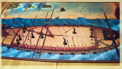 Der Spielplan zeigt die Route unseres Schiffes von der Goldinsel bis zur Meuterei. Außerdem sehen wir unser Schiff und hier vor allem das Deck, auf dem dann die Meuterei ausgetragen wird. Mal sehen, wer diese Partie gewinnt …