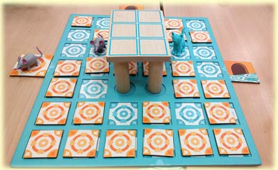 Ein Käse: Für die Mäuse super, denn die müssen 10 davon finden. Für die Katze schlecht, denn sie darf nicht über Käse laufen oder drauf stehenbleiben (außer, sie deckt ihn auf). Mäuse nehmen den Käse runter, die Katze lässt ihn liegen.