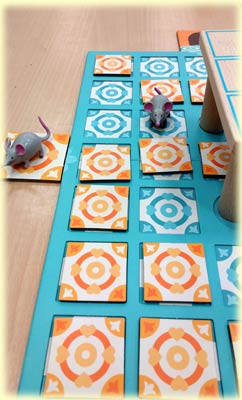 Eine Zahl: Mäuse und Katze dürfen entsprechend weiterlaufen und eventuell wieder eine Fliese aufdecken. Dabei darf nur die Katze auf den Tisch springen und ihn als Lauffläche benutzen, und nur die Mäuse können unter dem Tisch entlanglaufen und sich dort vor der Katze in Sicherheit bringen. Auch hier: Fliese weg.