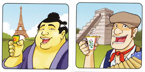 Jeder der bis zu 6 Spieler erhält zu Beginn eine Charakterkarte: Hierauf ist in Comic-Grafik ein Landsmann mit dazugehörigem Nationalgetränk und Geste, dem üblichen Trinkspruch sowie ein im Hintergrund dargestelltes Nationalgebäude zu erkennen. Beispielsweise die Karte für den Deutschen: Eine im Dirndl gekleidete, propere Blondine stemmt eine Maß Bier und ruft: Prost. Zudem ist im Hintergrund das Brandenburger Tor abgebildet. Die Gesten der einzelnen Nationen unterscheiden sich hier auch noch. So hebt der Franzose sein Champagnerglas, der Russe wirft sein Glas dagegen über die Schulter usw.