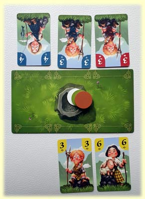 Vorbereitungen: Jede Person nimmt sich die 5 Schilde von genau einer Farbe. Je nach Spielerzahl werden 4 bis 6 Tableaus in einer langen Reihe platziert, an den beiden äußeren Enden mit je einem abgebildeten Lagerfeuer. Von den Spielkarten im Wert von 3 - 8 ist vorerst je 1 Exemplar in 7 Farben im Stapel. Je nach Spielerzahl werden einige Werte und einige Karten vom gemischten Stapel entfernt. Im Spiel zu zweit - Gegenstand dieser Rezension - werden an den Startspieler 9 Karten verteilt und an den anderen Spieler 8. Bei jeder Kombination von Spielern erhält der letzte in der Runde 1 Karte weniger.