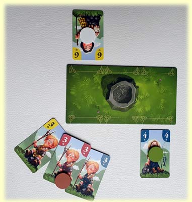 Das Spiel spielt sich flott, da man ja max. 9 Handkarten hat und somit 8-mal dran ist. 8-mal, weil einer der Spieler nur 8 Karten hat und das Spiel beendet. Er hat zwar 1 Karte weniger, ist dafür aber später dran, was vorteilhaft sein kann. Es kommt hier überhaupt immer auf den richtigen Zeitpunkt an, wann man 1 seiner 5 Schilde plaziert. In einem solchen Fall checkt man zunächst, ob es sich lohnt, später bei der Abrechnung Erster zu sein und damit nur die Karten des niedrigsten Wertes zu erhalten oder ob man sich bessere Punkte aus einer späteren Position im Schildstapel erhofft. Im selben Stapel darf man mehrmals eine Scheibe liegen haben.