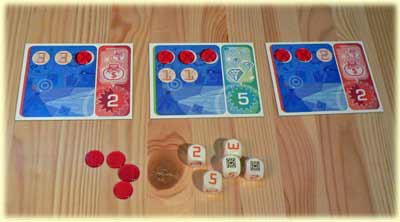 Bestehend aus einem Würfelset von fünf Würfeln, den zu erringenden Tresorkarten und roten Farbchips sowie der Spielregel ist der Zugang zum Spiel im Gegensatz zum Zaster kinderleicht: Die Tresorkarten werden verdeckt gemischt, zu einem Stapel aufgetürmt und die obersten drei Karten offen in die Mitte gelegt. Die Farbchips liegen griffbereit daneben. Auf den Tresorkarten sind je nach Wert drei bis sechs Zahlenfelder mit Werten zwischen 1 und 5 abgebildet.