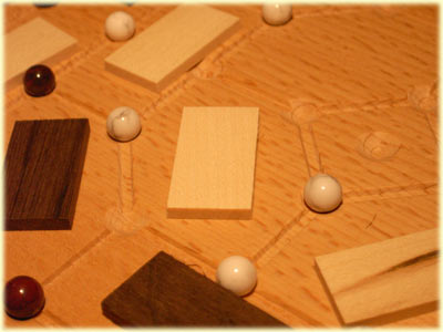 Zum Material: Das Spielfeld der neuen Version von ConHex besteht aus einer sehr robusten Holzplatte. Zur Markierung der Knoten werden Steinkügelchen verwendet, die mit einem leichten Marmoreffekt versehen sind. Sie wirken optisch sehr ansprechend, dennoch hätte ich mir zur Verbesserung des haptischen Erlebnisses etwas größere Kugeln gewünscht. Die eroberten Gebiete werden mit Holzbrettchen belegt. Die Brettchen sind vielleicht nicht der Hingucker, auf dem Spielbrett liegend wirken sie jedoch stimmig und runden den im Gesamten positiven Eindruck ab.
