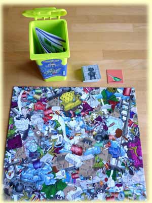Ein Müllhaufen ist natürlich das perfekte Motiv für die Suche nach bestimmten Einzelbildern, denn an einem solchen Ort liegt massenweise Zeug kreuz und quer herum. Das sorgt auch dafür, dass das Puzzeln gar nicht so leicht fällt, denn es gibt ja kein offensichtliches Oben und Unten, Links und Rechts. Da sind 6-Jährige beim Zusammensetzen schon ein bisschen gefordert. Das Spiel an sich geht dann meistens recht schnell – und umso schneller, je öfter man es schon gespielt hat. Eindeutig sind hier auch jene im Vorteil, die schon einige Partien hinter sich haben, denn mit der Zeit merkt man sich, wo die gesuchten Bilder versteckt sind, zumal es nur 18 Kärtchen gibt.
