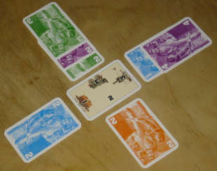 Als Belohnung liegen an der Drehscheibe 8 Punktekarten mit Werten von 5 und 4 und am Ziel 6 Punktekarten mit Werten von 6 – 3. Außerdem hält jeder Spieler Heizerkarten mit Werten von 1-6 auf der Hand. 2 x 1, 2 x 2, 2 x 3, 1 x 4, 1 x 6 mit deren Hilfe er seine Lokomotiven über seinen Schienenstrang bewegt.