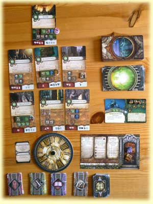 Zu Beginn wählt jeder Spieler einen Charakter und stattet diesen mit den entsprechenden Punkten für Geistesstärke und Ausdauer sowie etwaigen Sonderkarten aus. Außerdem werden sechs Aufgabenkarten und die Uhr ausgelegt. Im Spiel gilt es, gegen einen der Großen Alten zu kämpfen - daher wird zum Schluss noch eine dieser Karten aufgedeckt.