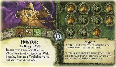 Diese Verderbenmarker kommen entweder durch missglücktes oder geglücktes (ja, Sie haben richtig gelesen, auch das kann passieren!) Aufgabenlösen auf die Karte des großen Alten oder durch die Uhr. Nach jedem Spielerzug wird diese nämlich um drei Stunden vorgerückt. Wenn der Zeiger nach vier Spielzügen auf die 12 zeigt, wird eine Mythoskarte aufgedeckt. Selten bringen diese Karten etwas Gutes - meistens gibt es Verderbenmarker oder Monster. Letztere werden auf die Aufgabenkarten gelegt, wodurch diese erschwert werden.