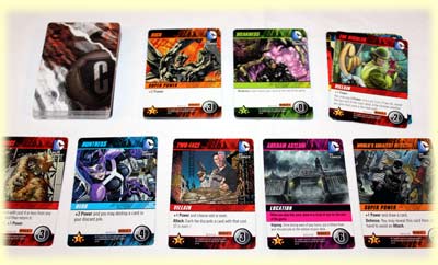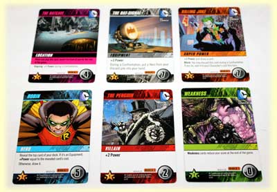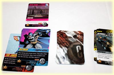 Der Joker hingegen schart gerne andere Schurken um sich, wie Ra's Al Ghul, Bane, den Pinguin, Two Face, etc. (rote Karten), und nutzt Superkräfte (orange), die in seinem Fall etwas speziell ausfallen (manisches Lachen, Wahnsinn oder "Killing Joke"). Die zum eigenen Charakter passenden Karten bringen im Laufe des Spiels mehr Vorteile als die anderen, trotzdem sollte man die Karten der anderen Gruppe nicht vernachlässigen, und sei es nur, um diese seinem Kontrahenten vorzuenthalten. Die stärkeren Karten sind ohnehin - unabhängig ihrer Zugehörigkeit - sehr begehrt.