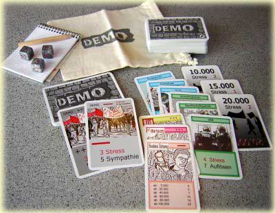 Man darf das Spiel also nicht bitterernst nehmen und nur auf Sieg spielen wollen. Notorischen Grüblern und Strategen ist daher von diesem Kartenspiel eher abzuraten - sie gehören definitiv nicht zur Zielgruppe. Spaß und Kommunikation stehen im Vordergrund. Natürlich hängt es von der Spielgruppe ab, aber eine Partie, in der nicht gelacht und wenig geredet wird, dürfte es nur sehr selten geben. Dazu trägt zum einen das Bestimmen des Mottos einer Demo bei, eigentlich eine für den Spielverlauf vollkommen unbedeutende Angelegenheit. Aber wenn sich alle auf das Spiel einlassen und immer wieder ein neues, noch skurrileres Thema für ihre Demo wählen, kann sich das sehr positiv auf die Stimmung auswirken. Zum anderen führt die ständige Berechnung der Stresspunkte eigener und fremder Kundgebungen zu erhöhtem Gesprächsbedarf. Da sich die Auslage permanent ändert und man schnell den Überblick über den Punktestand verliert, wird ununterbrochen nachgefragt und gemeinsam gerechnet.