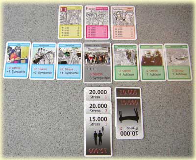 Diese Rechnerei hemmt den Spielverlauf und ist somit auch einer der größten Kritikpunkte. Hier wäre es besser gewesen, dem Spiel beispielsweise Zahlenplättchen zu spendieren, die man einfach auf die Demokarte legt, so dass der aktuelle Stressfaktor für alle stets gut sichtbar ist. Aufgrund der schlechten Übersicht verliert man auch schnell aus den Augen, ob zu einer Demo gerade eine Gegendemo ausliegt. Da diese immer den Stressfaktor erhöht, ist dies nicht unbedeutend. Mit je zwei farblich passenden Markern hätte man dieses Problem einfach lösen können. Auch ist die Auslage recht platzintensiv, selbst wenn man die Karten überlappend legt. Theoretisch könnten laut Spielregel alle 12 Demos gleichzeitig stattfinden. Von einem Praxistest ist aber dringend abzuraten, es sei denn, man würde ihn in die Fußgängerzone verlegen. Dann bekäme auch der Untertitel des Spiels eine ganz andere Bedeutung.